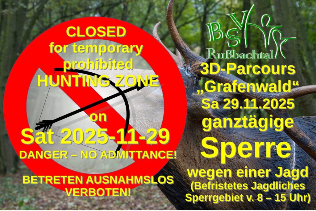 Aus Sicherheitsgründen ist daher am 29.11.2025 der Parcours ganztägig gesperrt (ganztägig kein Schießbetrieb!) und das Betreten des Bereichs von 08:00 – 15:00 Uhr ausnahmslos untersagt! Ausgenommen sind nur die Teilnehmer an der Jagd.